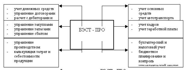ПП «БЭСТ - ПРО» – управление хозяйственной деятельностью для торговых и производственных предприятий. На рисунке 3.2 представлен состав системы «БЭСТ - ПРО». Система поддерживает несколько планов счетов и позволяет вести учет в стандартах РФ, GAAP, IAS и др.