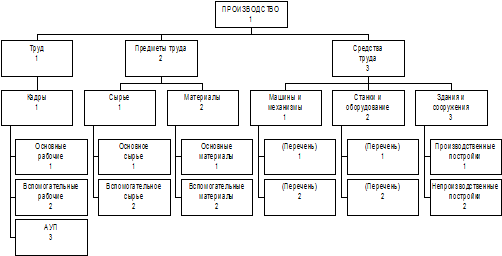 Рассмотрим пример классификации основных объектов производства. (Рис 2.7.2) Здесь труд, предметы труда, средства труда составляют групп однородных объектов.
