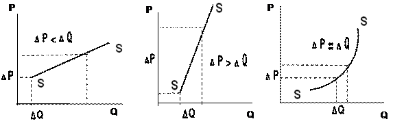 При единичной эластичности (Es=1) предложения однопроцентное увеличение цены товаров вызовет увеличение их предложения на 1% (Рис.6.5.в).