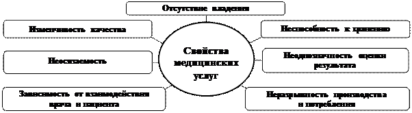 Медицинские услуги, имеют ряд свойств, отличающие их от товара, например от медикаментов: отсутствие владения; неосязаемость; неспособность к хранению; неразрывность производства и потребления; изменчивость качества, неоднозначность оценки результата, зависимость от тесного взаимодействия врача и пациента (Рис. 8.3).Отсутствие владения. Если человек приобрел товар, имеющий физическое воплощение, скажем фонендоскоп, то он становится его владельцем, чего нельзя сказать о медицинской услуге. Нельзя владеть, например, результатом, полученным от операции аппендэктомии.