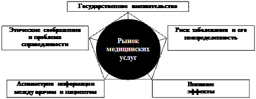 Рынок медицинских услуг имеет ряд основных характеристик: риск заболевания и его неопределенность, внешние эффекты, асимметрия информации между продавцом и покупателем, этические соображения и проблема справедливости, а также государственное вмешательство (Рис. 8.5).