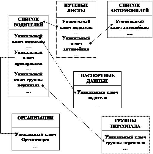 После определения состава атрибутов, необходимо определить первичные ключи. Обычно (следуя определению первичного ключа) они определяются для таблиц, содержащих нормативно-справочные данные. Окончательно взаимосвязи таблиц с учетом определения первичных ключей можно представить в следующем виде (рис 5.5.2):