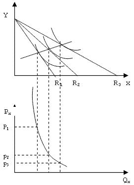 При прочих равных условиях потребитель предпочтет количество товаров на кривой, максимально отдаленной от центра – точка касания с линией бюджетного ограничения. Максимально удаленная при условии полного расходования бюджета потребителя.