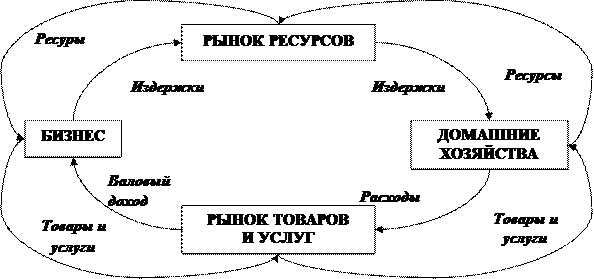 С рынка ресурсов ресурсы направляются в бизнес. Бизнес за ресурсы обязан расплачиваться и все расчет за ресурсы представляют для бизнеса издержки. Бизнес – любое лицо (Юридическое или Физическое), производящее товары и услуги. Созданные бизнесом товары и услуги отправляются на рынок, откуда идут в домашние хозяйства. Домашние хозяйства несут расходы на товары и услуги, которые для бизнеса представляют валовый доход.