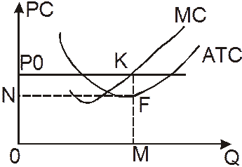 В ситуации, когда цена на продукцию уже не покрывает полных издержек перед фирмой стоит вопрос о продолжении производства. Если цена на продукцию меньше средних полных издержек, но полностью компенсируют средние переменные издержки (основные производственные затраты), решение фирмы определяется перспективами долгосрочного периода. Если в долгосрочной перспективе у фирмы имеется возможность снизить средние полные издержки или возможно увеличение цены, то в некотором краткосрочном периоде фирме целесообразно работать с убытками. Заштрихованная область – наличие минимальных убытков.