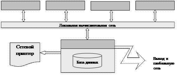 На практике такую систему можно представить в виде одноранговой сети с выделенным сервером. При этом в качестве терминалов пользователей и самого сервера используются обычные персональные компьютеры. Следует отметить, что в отличие от терминалов сервер всегда должен быть доступен. Компьютеры объединяются в единую локальную сеть. Данная сеть должна соответствовать специфике АИС: расстояние до терминалов, скорость передачи данных, надежность системы. Целесообразно установить на сервере принтер для общего пользования. Доступ в глобальную сеть по телекоммуникационным линиям производится также через выделенный сервер.