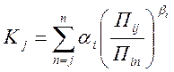 где i – число параметров продукции, участвующих в оценке; j = 1,..., п – виды продукции; αi – коэффициент важности (значимости, предпочтительности) для покупателя i– го параметра по сравнению с остальными существенными параметрами продукции; Пij – конкурентное значение i -го параметра для j -й продукции; Пin – желаемое значение i -го параметра, которое позволяет полностью удовлетворить потребность покупателя: bi = + 1, если увеличение параметра Пij способствует росту конкурентоспособности продукции (например, надежности, производительности изделия и т.д.); bi = – 1, если увеличение значения параметра Пij приводит к снижению конкурентоспособности продукции (например, вес, габарит, цена и др.)