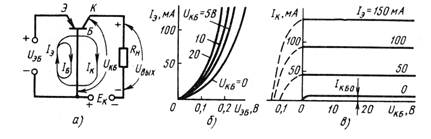 Рис. 14. Входные (а) и выходные (б) характеристики схемы транзистора с общим эмиттером; в — схема определения полярности напряжения на коллекторном переходе