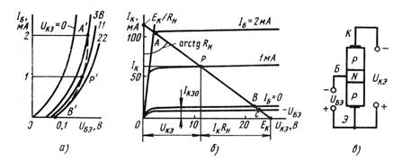 Рассмотрим, как учесть влияние нагрузки в схеме ОЭ. Для этого из точки ЕК(рис. 14,б) проведем прямую под углом arctg Rн к оси токов. Тогда точка пересечения нагрузочной прямой, как называют эту линию, со статической выходной характеристикой определяет текущее значение тока IК и распределение напряжения питания ЕБ между транзистором UКЭ и нагрузкой IКRн для тока базы IБ, являющегося параметром этой статической характеристики. На рисунке обозначены построения для точки пересечения р при IБ =1 мА. Нетрудно видеть, что подача тока базы IБ =2 мА приведет к перераспределению напряжений, определяемому точкой А, а при отсутствии сигнала — определяемому точкой В.