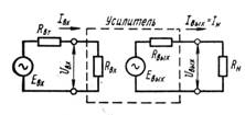 Входное и выходное сопротивление. Усилитель можно рассматривать как активный четырехполюсник, к входным зажимам которого присоединен источник усиливаемого сигнала с ЭДС Евх и внутренним сопротивлением Rвт, а к выходным — сопротивление нагрузки Rн. Для выходной цепи усилитель представляет источник ЭДС Евых с внутренним сопротивлением Rвых (рис. 18).