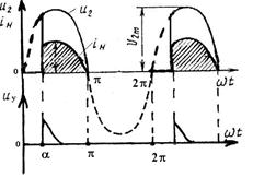 При изменении угла от 0 до a тиристор Д закрыт. Напряжение и ток нагрузки Rн отсутствуют. При угле a на тиристор подается управляющий сигнал Uу. Тиристор открывается и далее схема вплоть до 2p работает в обычном выпрямительном режиме. С момента 2p вышеописанная процедура повторяется. В данном устройстве a можно изменять от 0 до p. При этом постоянные составляющие напряжения (U0) и тока (I0) нагрузки соответственно изменяются от