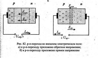 Если к p-n-переходу приложить внешнее напряжение Uобр которое создает в запирающем слое электрическое поле напряженностью Евн совпадающее по направлению с полем неподвижных ионов напряженностью Езап., то это приведет к расширению запирающего слоя, так как носители заряда уйдут от контактной зоны. При этом сопротивление p-n-перехода велико, ток через него мал, так как обусловлен Iобр, а p-n-переход – закрытым.