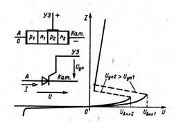 Фототиристор с тремя р-п переходами также имеет два вывода -анодный и катодный. Его ВАХ подобна ВАХ триодного тиристора с той особенностью, что напряжение включения UBKJl зависит от освещенности фототиристора.