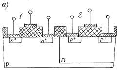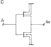 ) т. к. один из транзисторов постоянно закрыт, высоким быстродействием, что обусловлено поочередной работой транзисторов, высокой помехозащищенностью, достигающей 40% в режиме питания. Принцип работы заключается в том, что при подаче на вход положительного смещения работает транзистор 1, при подаче отрицательного смещения на вход нет необходимости рассасывать объемный заряд в области сток-исток для подготовки транзистора 1 к исходному состоянию, т. к. этот сигнал будет обслуживать транзистор 2. Отрицательный сигнал на затворе транзистора 2 притянет электроны к поверхности и создаст структуру