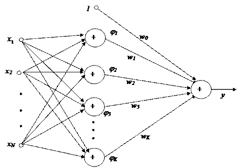 Полученное решение, представляющее аппроксимирующую функцию в многомерном пространстве в виде взвешенной суммы локальных базисных радиальных функций (выражение (4.3)), может быть интерпретировано радиальной нейронной сетью, представленной на рис. 4.2, в которой