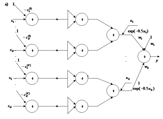 На рисунке 4.3 приведена детальная структура RBF- сети с радиальной функцией вида (4.5).