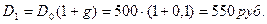 Дивиденд за прошлый год составил 500 руб. Ожидается прирост дивиденда g =10% в год. Найти дивиденд за текущий год и за следующий год.
