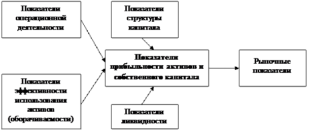 Целесообразным упорядочить финансовые показатели по признаку операционной деятельности как главного фокуса предприятия с учет рыночной ориентации (рис. 11.) Суть предлагаемого подхода состоит в том, что основным показателем результативности предприятия признан показатель прибыльности собственного капитала (обычно обозначается ROE). Таким образом, на первое место ставится интерес собственника. Данный показатель обеспечивается, главным образом, двумя факторами: прибыльностью продаж (этот показатель принадлежит группе показателей операционной деятельности) и оборачиваемостью активов (группа показателей эффективности использования активов). В самом деле, каждый предприниматель понимает, что высокую отдачу от использования вложенных средств можно обеспечить высокой «маржей продаж» и/или высокой оборачиваемостью оборотных средств. Оценка показателей ликвидности является неотъемлемой частью диагностической процедуры. Их назначение состоит в том, чтобы предостеречь менеджмент предприятия от излишнего увеличения оборачиваемости. «Помни об угрозе банкротства» - говорят эти показатели. Наконец, отдачу от использования вложенных собственником средств можно увеличить за счет использования долгосрочных заемных ресурсов. Эту часть деятельности компании (она называется финансовой) характеризует группа показателей структуры капитала.
