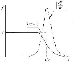 При вычислениях используют особенности зависимости функции распределения ее производной от энергии (см. рис. 1.4). Как видно из рис. 1.4, функция f близка по форме к ступеньке ( функция Хевисайда), а ее производная к -функции Дирака. Учитывая это обстоятельство, из (1.7) получают