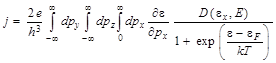 Интегрирование по dpx проводится в пределах от нуля до бесконечности, поскольку пересекать границу эмиссии могут только те электроны, которые двигаются слева направо. Интегрирование по dpy и dpz проводится по всем значениям, поскольку эмиттировать частица может с любым значением составляющей импульса, лежащей в плоскости эмиссии. Размерность плотности тока есть произведение заряда на концентрацию и на среднюю дрейфовую скорость