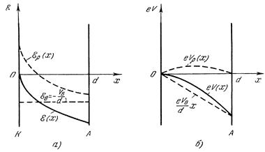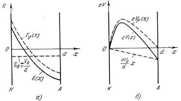 наибольшая у катода, то во всем межэлектродном пространстве E (х) < 0, так что всюду между катодом и анодом на электроны действует только ускоряющее поле. Результирующая кривая eV (x)максимума не имеет. Схематически вид зависимостей