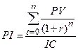 Индекс рентабельности инвестиций - PI. Является относительным показателем, который характеризует уровень доходов на единицу затрат, т.е. эффективность вложений - чем больше значение этого показателя, тем выше отдача каждого рубля, инвестированного в данный проект.