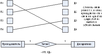 Случай 1. Каждый преподаватель может читать только одну дисциплину, каждая дисциплина читается не более чем одним преподавателем. Степень связи 1:1, класс принадлежности обеих сущностей обязательный.