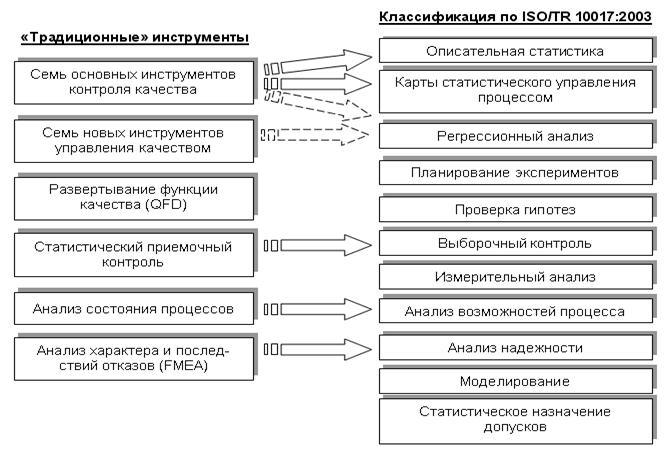 Международный стандарт ISO 9004–4:1993 «Руководящие указания по улучшению качества» содержал рекомендации по применению большинства из перечисленных инструментов — наиболее простых, не требующих знаний математической статистики и доступных работникам любого уровня. В современной версии семейства международных стандартов ISO серии 9000 (МС ИСО 9000) появился стандарт, полностью посвященный статистическим методам: ISO/TR 10017:2003 «Руководство по статистическим методам применительно к ИСО 9001:2000». Он предлагает современную классификацию статистических методов (семейств методов) управления качеством. Это описательная статистика, планирование экспериментов, проверка гипотез, измерительный анализ, анализ возможностей процесса, регрессионный анализ, анализ надежности, выборочный контроль, моделирование, карты статистического контроля процесса (карты СКП), статистическое назначение допусков, анализ временных рядов. Перечисленные методы включают в себя большинство из «традиционных» (наиболее простых и известных) инструментов.