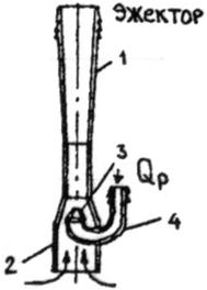 где 1 – диффузор, 2 – приемная камера с конфузором, 3 – конический насадок, 4 – т/п рабочей жидкости.