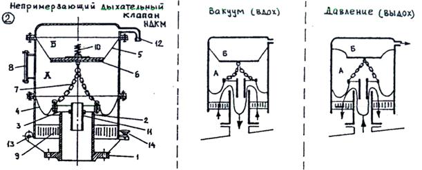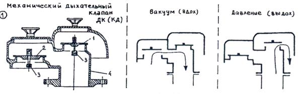 Сейчас используются: КД (ДК), НДКМ, КДН. Устройство и работа дыхательного клапана типа КД изображена на Рис 1.
