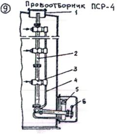 Насосом 5 создается давление в воздушной трубке, под действием которого открывается сильфонный клапан 3 и в пробоотборную трубку поступает продукт. Затем давление сбрасывают, клапаны закрываются и отобранный столб нефтепродукта через сливной клапан 6 сливается в пробоотборную емкость и доставляется на анализ в лабораторию.