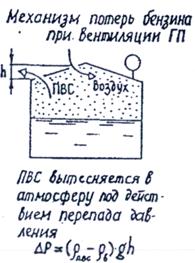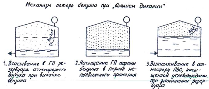 1) потери от «больших дыханиях» резервуара – выход газовой смеси при заполнении резервуара, т.е. уровень взлива нефтепродукта изменяется.