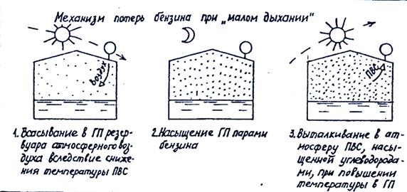 2) потери от «малых дыханий» резервуара – выход газовой смеси в результате изменения температур и давления газовой смеси резервуара и соответствующих параметров внешней среды. В этом случае процесс происходит при неподвижном уровне нефтепродукта.