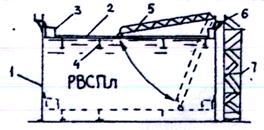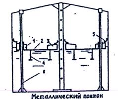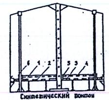 где 1 – периферийный короб понтона для обеспечения плавучести, 2 – дека понтона (могут быть одно- и двухдечные понтоны); 3 – центральный короб; 4 – опорные стойки (высота 1,8-2 м.); 5 – кольцевой затвор для герметизации щели между понтоном и стенкой резервуара; 6 – направляющие стойки;