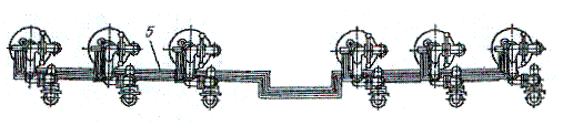 Стендер представляет собой устройство из семи труб-звеньев, соединенных шестью шарнирами. В исходном положении стендеры присоединены к фальшпатрубкам 2.