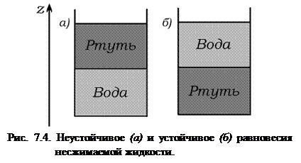 Очевидно, что состояние равновесия, изображенное на рис. 7.4, а, будет неустойчивым, т.к. частица ртути, смещенная в слой воды, в силу того, что действующая на нее архимедова сила будет меньше действующей на нее силы тяжести, начнет опускаться вниз. Равновесие же, изображенное на рис. 7.4, б, будет устойчивым.