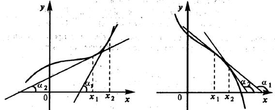 Геометрическая интерпретация условия монотонности функции: если касательные к кривой на некотором промежутке направлены под острыми углами к оси абсцисс, то функция возрастает, а если под тупыми, то убывает (см. рисунок 3.6).