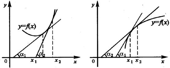 Можно доказать, что функция выпукла вниз (вверх) тогда и только тогда, когда ее первая производная на соответствующем промежутке монотонно возрастает (убывает). Геометрически это означает, что если f `(x) возрастает (убывает) на промежутке X, то возрастает (убывает) угол наклона касательных к ее графику (см. рисунок 3.8).