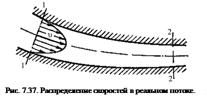 Рассмотрим участок трубы (в общем случае переменного сечения), по которому течет некоторая жидкость (рис. 7.37). Будем считать, что в пределах рассматриваемых поперечных сечений потока справедлив основной закон гидростатики, т.е. гидростатический напор в пределах сечения есть величина, одинаковая для всех точек данного сечения: