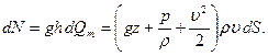 Введем понятие мощности потока. Мощностью потока в данном сечении будем называть полную энергию, которую проносит поток через это сечение в единицу времени. Так как в различных точках поперечного сечения потока частицы жидкости обладают различной энергией, вначале выразим элементарную мощность (мощность элементарной струйки) в виде произведения полной удельной энергии жидкости в данной точке на элементарный массовый расход: