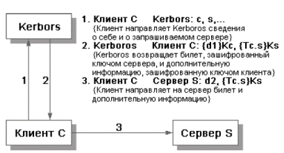 Чтобы с помощью Kerberos получить доступ к S (обычно это сервер), C (как правило – клиент) посылает Kerberos запрос, содержащий сведения о нем (клиенте) и о запрашиваемой услуге. В ответ Kerberos возвращает так называемый билет, зашифрованный секретным ключом сервера, и копию части информации из билета, зашифрованную секретным ключом клиента. Клиент должен расшифровать вторую порцию данных и переслать ее вместе с билетом серверу. Сервер, расшифровав билет, может сравнить его содержимое с дополнительной информацией, присланной клиентом. Совпадение свидетельствует о том, что клиент смог расшифровать предназначенные ему данные (ведь содержимое билета никому, кроме сервера и Kerberos, недоступно), т.е. продемонстрировал знание секретного ключа. Значит, клиент – именно тот, за кого себя выдает.