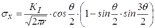 Когда известен коэффициент КI поле напряжений при вершине полностью определено. В частности, при плоском напряженном состоянии для нагрузки по схеме I формулы (2.10) имеют вид