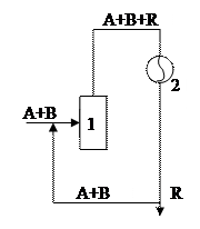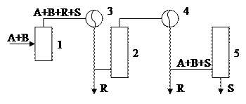 Смесь исходных веществ А и В поступает в реактор [1] в котором происходит химическое взаимодействие между реагентами. На выходе из реактора в газовой смеси содержится продукт реакции и не прореагировавшие исходные реагенты А и В. Газовая смесь поступает в конденсатор [2], где она охлаждается, при этом продукт реакции R конденсируется и выводится из системы, а исходные реагенты А и В возвращается в процесс.