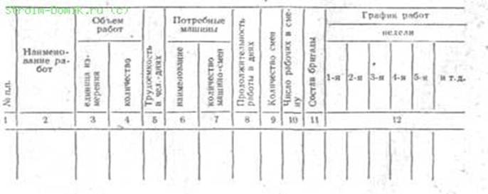 В табл. 7 приведена форма календарного плана производства работ на объекте, предусмотренная «Инструкцией о порядке составления и утверждения проектов организации строительства и проектов производства работ» (СН 47-67).