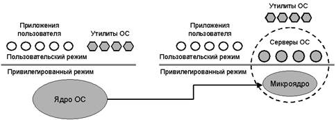 Суть микроядерной архитектуры состоит в следующем [4]. В привилегированном режиме работает только очень небольшая часть операционной системы, называемая микроядром. Микроядро защищено от остальных частей ОС и от приложений. Набор функций микроядра соответствует функциям слоя базовых механизмов обычного ядра. Это те функции, которые нельзя выполнить в пользовательском режиме. На рисунке 1.2 показан механизм переноса основного объема функций ядра в пространство пользователя [4].