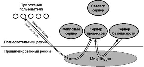 На рисунке 4.2 показан механизм обращения к функциям ОС, оформленных в виде серверов. Клиент, которым может быть либо прикладная программа, либо другой компонент операционной системы, запрашивает выполнение некоторой функции у соответствующего сервера, посылая ему сообщение. Непосредственная передача сообщений между приложениями невозможна, так как их адресные пространства изолированы друг от друга. Микроядро, выполняющееся в привилегированном режиме, имеет доступ ко всем адресным пространствам, поэтому может работать в качестве посредника. Таким образом, работа микроядерной операционной системы соответствует модели клиент-сервер, в которой роль транспортных средств выполняет микроядро.
