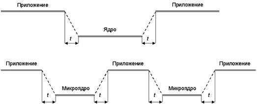 Основным недостатком микроядерной ОС является сниженная по сравнению с классической ОС производительность. Дело в том, что при классической организации ОС выполнение системного вызова сопровождается двумя переключениями режимов, а при микроядерной архитектуре – четырьмя. Ситуация иллюстрируется рисунком 4.3.