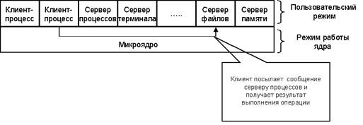 Обычно для этого выполнение большинства задач операционной системы перекладывается на пользовательские процессы. Получая запрос на какую-либо операцию, например, чтение блока файла, пользовательский процесс (называемый теперь клиентским или обслуживаемым процессом) посылает запрос серверному (обслуживающему) процессу, который его обрабатывает и возвращает результат.