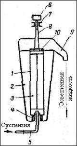 Разделение жидких неоднородных систем под действием центробежных сил осуществляется также в гидроциклонах. Принцип действия последних аналогичен циклонам. Схема гидроциклона представлена на рис. 65.