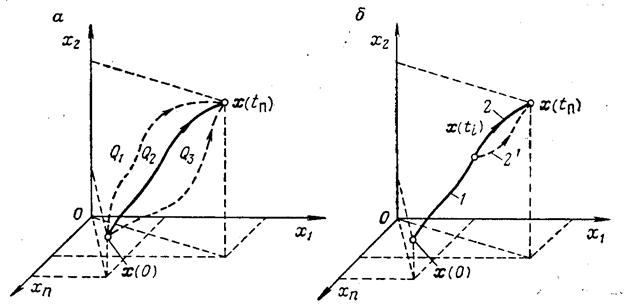 Задаче оптимального управления можно дать наглядную геометрическую интерпретацию в фазовом пространстве (рис. 6.2, а). Объект управления необходимо перевести из известного начального состояния, соответствующего точке х (0), в заданное состояние, характеризуемое точкой х (tn). Это можно осуществить, как правило, по нескольким траекториям, соответствующим различным формам управляющей вектор-функции у (t). Причем при каждом варианте управления будет получаться свое значение величины Q. Оптимальному управляющему воздействию у*(t) и оптимальной траектории х*(t) соответствует, очевидно, экстремальное значение Q*.
